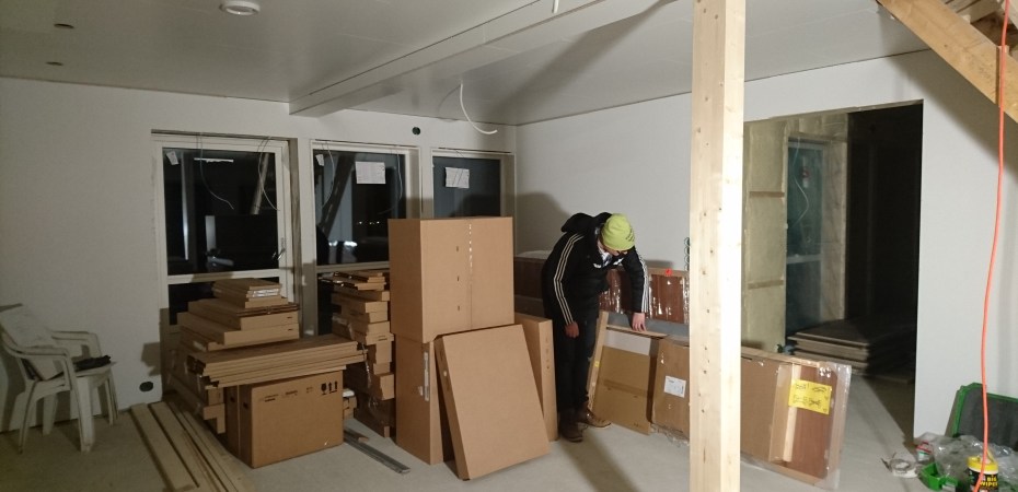 Tirsdag 13. desember kom det et trailerlass med flatpakker fra IKEA. Leveransen fra IKEA ble en uke forsinket, og plutselig måtte vi montere flatpakker siste helga i advent. Kjøkken, baderomsinnredning og diverse småtteri til arvingen fant til slutt veien opp til Evenesdal.