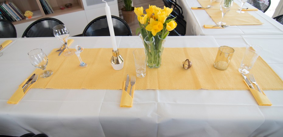 Vi lånte bord og stoler av Saltdal skytterlag, og pynta med påskegult. Det ble akkurat plass til 19 stk i stua etter å ha pakket bort noen møbler. På menyen sto kortreist lammelår fra fjøset til pappa, med mange gode kaker etterpå.