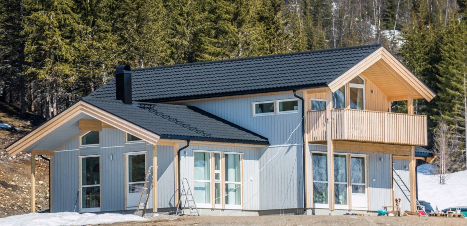 Farga vi har gått for heter «tåkedis». Når vi skulle kjøpe inn maling til helga hadde Byggern på Rognan kun fem spann med rett base til denne farga. På søndag hadde vi bare ett spann igjen, men siden de lettest tilgjengelige veggene ble malt på lørdag skulle det ta litt tid å få det siste spannet på veggen/takkassene. Vi ble nesten ferdig med det første strøket på hele huset. Noen små flekker gjenstår, til Byggern får inn et nytt parti med baser. VI skulle gjerne hatt et spann til med maling denne helga slik at vi kunne gjort ferdig første strøket. Om ikke annet begynt med hvitmalinga på lister og vindskibordene, men den hvitfarga vi skal bruke skal ha samme base som gråmalinga så da var vi like langt.