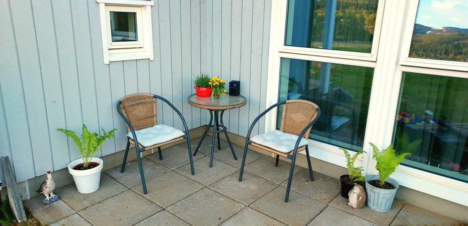 Her kan vi nyte morgensol og ettermiddagsskygge (ikke minst! Siste uke tatt i betraktning). Samtidig kan vi sitte nært der ungene leker. Resultatet ble ikke så verst! Nå skal det opp en liten hylle på veggen, og så skal gresset få gro rundt steinhellene, så får vi se hvordan det endelige resultatet blir.