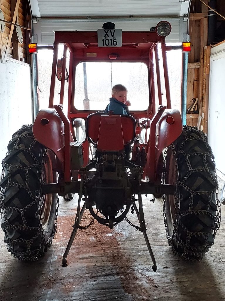 Den observante leser vil sikkert se at lasteapparatet er borte. Det ble tatt av i forbindelse med toppakning-byttet. Den ene hydraulikksylinderen lekte olje, og derfor ikke satt på igjen. Ellers er det litt småpjusk som må fikses, men traktoren er nå klar for bruk og vil fungere greit til å drive vedmaskina.